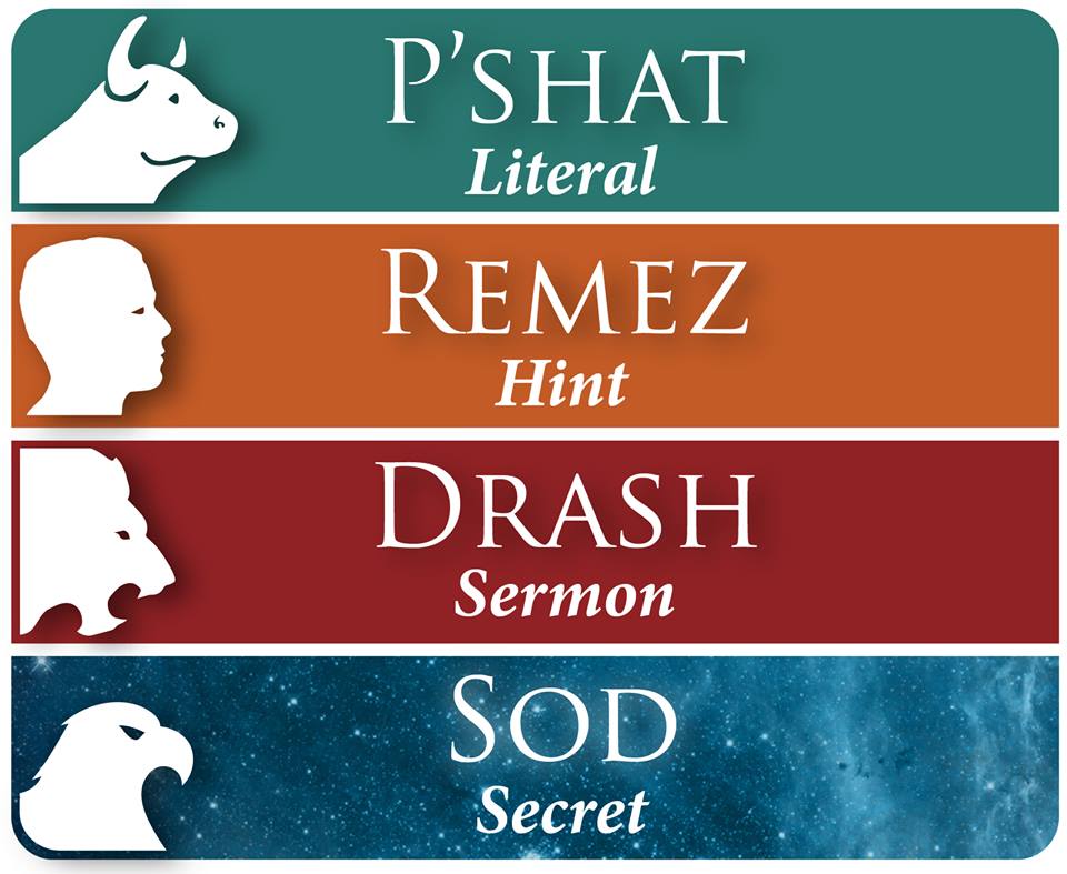The four levels of interpretation are called: Parshat, Remez, D’rash & Sod. The first letter of each word P-R-D-S is taken, and vowels are added for pronunciation, giving the word PARDES (meaning “garden” or “orchard”). Each layer is deeper and more intense than the last, like the layers of an onion.